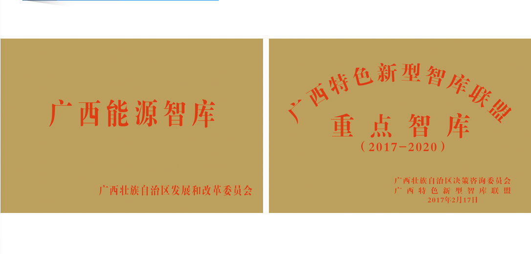 广西院设立广西能源智库,由广西壮族自治区发展和改革委员会批复成立,是广西壮族自治区决策咨询委员会认定的广西新型特色新型智库联盟重点智库,也是广西能源领域唯一的重点智库。致力于打造“政府专业特色智库,行业创新发展平台”,重点开展能源战略、规划及政策研究,能源体制改革及产业发展研究,能源企业发展规划与运营研究,“互联网+智慧能源”及大数据推广应用。